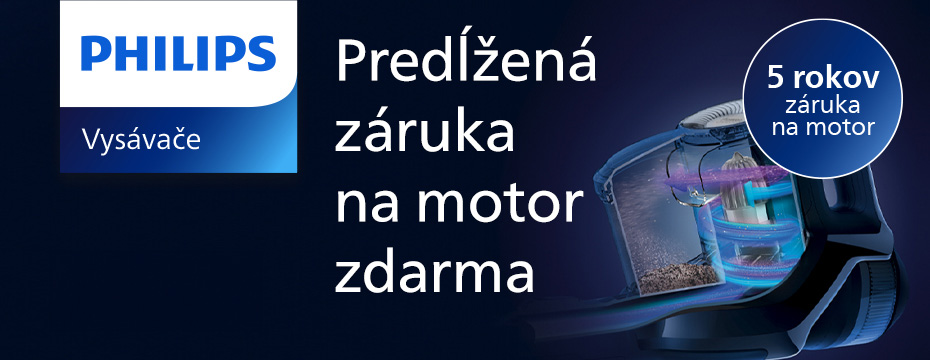 Získajte na vybrané sáčkové a bezsáčkové a tyčové Philips vysávače predĺženú záruku 5 rokov na motor.