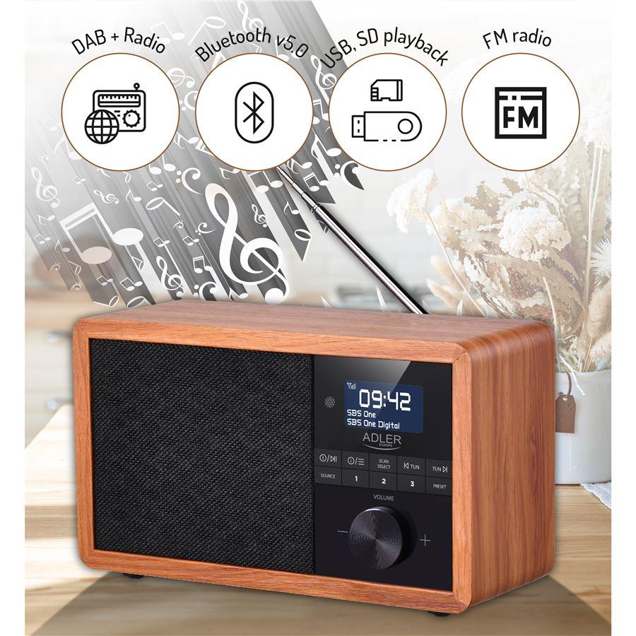 V ére technologického rozvoja očakávame nové riešenia aj v oblasti rádiových prijímačov. Doma aj v práci si radi spríjemníme chvíle hudbou alebo obľúbenými rozhlasovými programami. Využitie technológie Bluetooth v rádiu AD1184 umožňuje jeho bezdrôtové spojenie so zariadením, z ktorého prehrávate hudbu - smartfón, tablet alebo počítač. Elegantný dizajn a drevené puzdro umožňujú rádiu zapadnúť do každého interiéru. Rádio prijíma vysielanie na vlnách FM, AM a DAB+ a je vybavené dobre čitateľným LCD displejom. Rádio má vstavané hodiny a funkciu budíka. 3W reproduktory poskytujú čistý a ostrý zvuk a pamäť staníc vám umožní pohodlne ukladať vaše obľúbené a najčastejšie počúvané stanice. LCD displej umožňuje pohodlné ovládanie chodu prístroja a je zaujímavým akcentom v drevenom kryte.