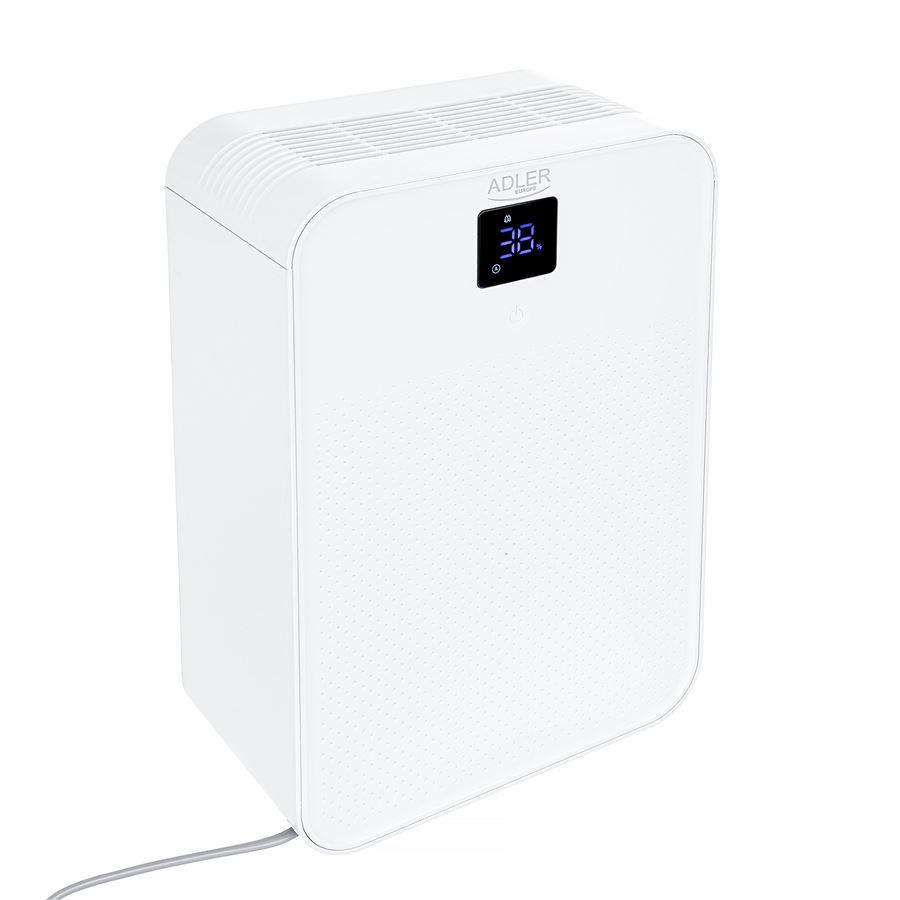 Termoelektrický odvlhčovač vzduchu Adler AD7860 je zariadenie, ktoré je nielen funkčné, ale aj zaujímavo riešené. Odvlhčovač je vybavený senzorom vlhkosti a senzorom indikujúcim, že nádrž je plná, čo spôsobí, že sa po naplnení automaticky vypne, vďaka čomu je používanie skutočne intuitívne a bezpečné aj v noci. LED displej informuje o aktuálnej vlhkosti vzduchu v miestnosti, čo umožňuje správne nastavenie parametrov zariadenia. Stačí sledovať meniace sa farby: červená (znamená vlhkosť rovná alebo väčšia ako 80 %), zelená (71-78 %) a modrá (vlhkosť menšia alebo rovná 70 %). Zariadenie využíva tri prevádzkové režimy (automatický, nepretržité sušenie a noc), ako aj dve rýchlosti ventilátora. Nádrž na vodu s objemom 1000 ml umožňuje dlhú prevádzku. Ďalšou výhodou je účinnosť 500 ml/24 hod. a účinnosť ventilátora 40 m3/ hod. Prevádzkový rozsah je približne 30 m3, preto sa oplatí umiestniť ho aj do malej kúpeľne.