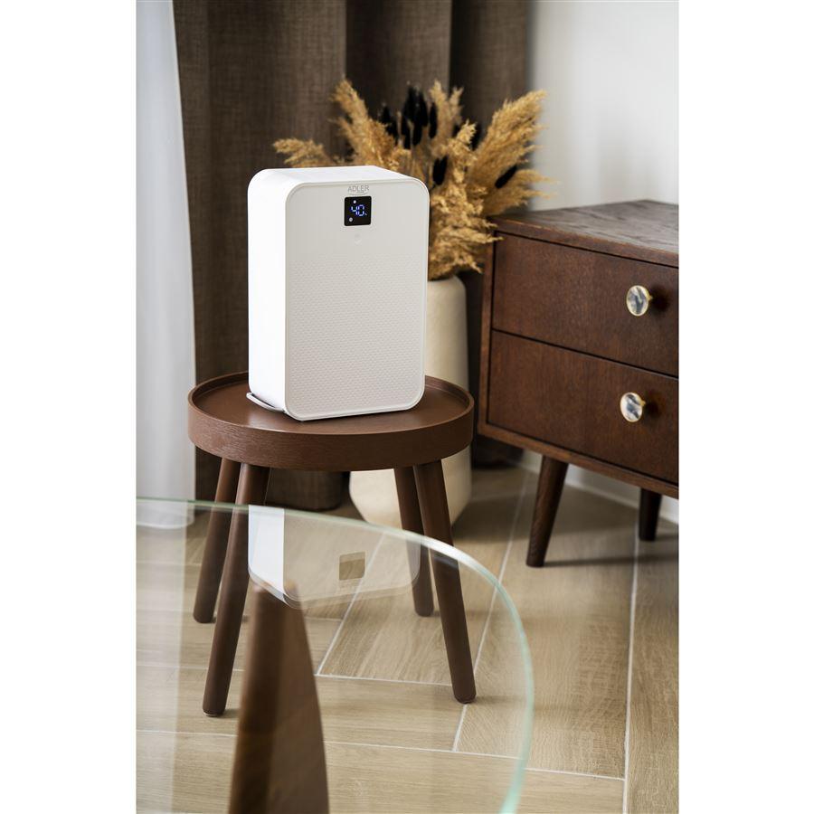 Zariadenie sa vyznačuje aj tichým chodom - hlučnosť je cca 35 dB, takže ho možno umiestniť aj do detskej izby. O činnosti odvlhčovača informuje akustický signál a 170 cm dlhý napájací kábel a nízka hmotnosť prístroja uľahčujú presun a zmenu nastavení. Elegantný vzhľad, aerodynamický tvar a žiarivá farba sú argumentmi pre to, že nevyčnieva z ostatného zariadenia a nenarúša aranžmán interiéru, v ktorom je umiestnený.