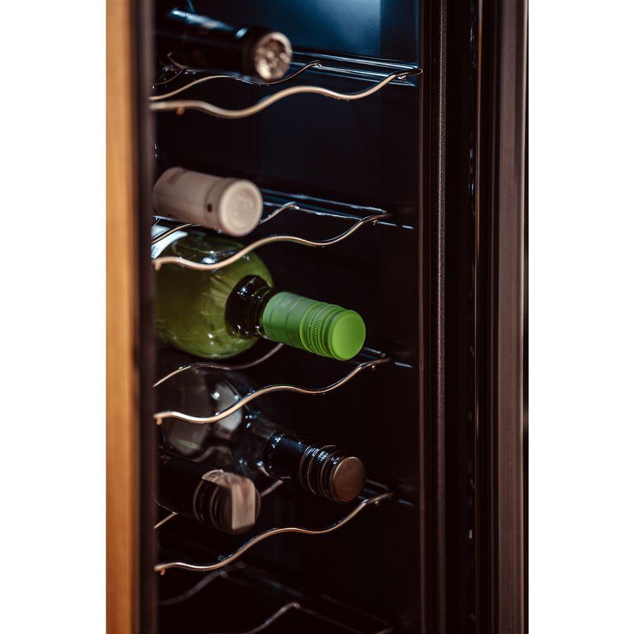Jednou z kľúčových výhod tejto vinotéky je jej nízka energetická náročnosť, ktorá umožňuje využívať zariadenie hospodárne bez straty účinnosti. Vďaka termoelektrickému chladiacemu prvku funguje ticho a zaisťuje diskrétne a nenápadné používanie. Elegantný ovládací panel vybavený dotykovými tlačidlami zaisťuje jednoduché a intuitívne ovládanie. Regulácia teploty od 12 do 18 stupňov Celzia umožňuje prispôsobiť podmienky skladovania špecifickému charakteru nápojov. Vnútorné osvetlenie vinotéky navyše zaisťuje komfort používania a izolované bezpečnostné sklo s UV filtrami chráni uskladnené nápoje pred škodlivými účinkami žiarenia. Vhodné chladenie založené na Peltierovej technológii zaručuje udržanie optimálnej teploty vo vnútri zariadenia. Je tu použitý termoelektrický článok, ktorý eliminuje pretrvávajúce bzučanie a hlasný chod zariadenia.