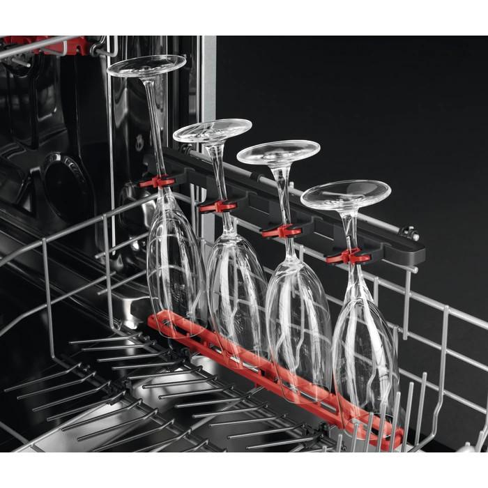 Držiak GlassHolder v umývačkách riadu AEG zaisťuje plnú ochranu pre všetok sklenený riad. Dolný kôš je vybavený príchytkami SoftGrips a mäkkými hrotmi SoftSpikes®, ktoré pridržiavajú poháre na svojom mieste, a tým spoľahlivo predchádzajú poškodeniu riadu.