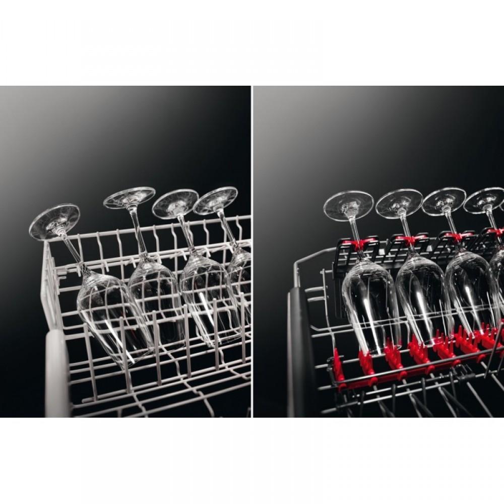 - Horný košík s: 2 sklopné držiaky, 2 sklopné drôtené úchyty na poháre, 2 mäkké gumové špičky , 6 úchytov na poháre na víno, sklopné držiaky na poháre, plastová rukoväť AEG, Side basket handles