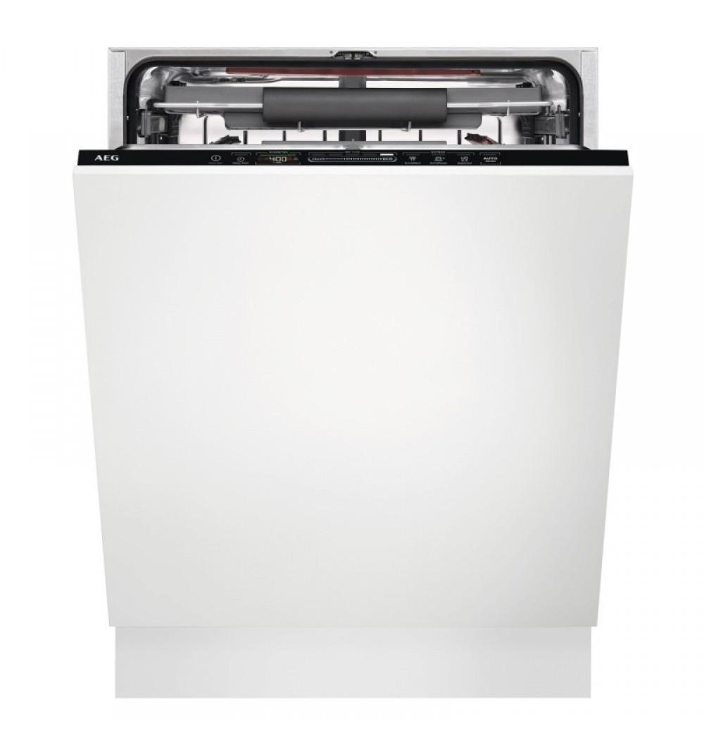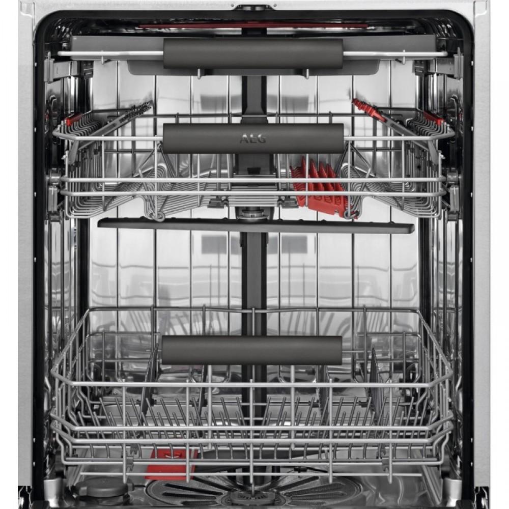 - Vlastnosti horného koša: 2 sklopné držiaky, 2 sklopné drôtené úchyty na poháre, 2 mäkké gumové špičky , 6 úchytov na poháre na víno, sklopné držiaky na poháre, plastová rukoväť AEG, Side basket handles