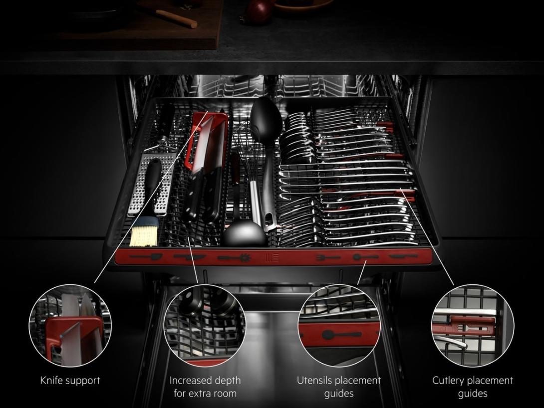 Zásuvka MaxiFlex je navrhnutá pre príbory a náradie rôznej veľkosti a tvarov. Vďaka pružným deliacim priečkam a pridanej hĺbke si ju ľahko prispôsobíte podľa potreby. Ľahko porozumie a umýva väčšinu riadu naraz, aj keď ide o náradie ako sú varečky, naberačky alebo štiepacie metly.