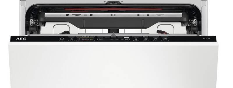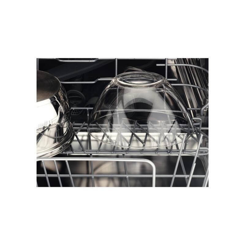 • Vlastnosti horného koša: 2 sklopné držiaky, 2 sklopné drôtené úchyty na poháre, 2 mäkké gumové špičky , 6 úchytov na poháre na víno, sklopné držiaky na poháre, antikorová rukoväť AEG, postranné držiaky košíka