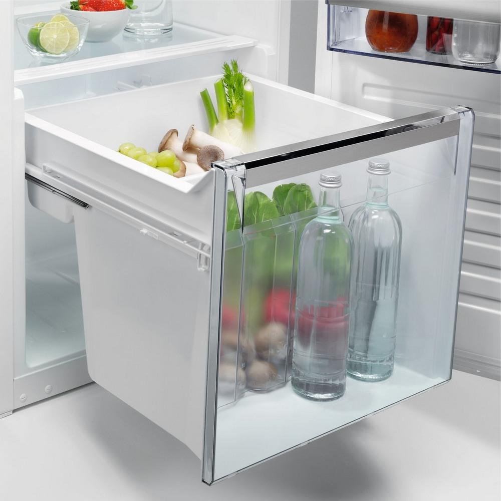 Výsuvná zásuvka poskytuje perfektný prehľad a prístup k čerstvým potravinám. Vďaka inovatívnemu dizajnu ju môžete úplne vysunúť von. Potraviny tak pohodlnejšie uložíte alebo vyberiete a navyše sa zjednoduší aj čistenie chladničky.