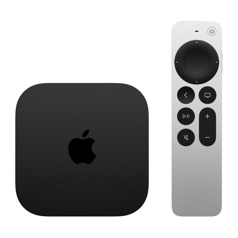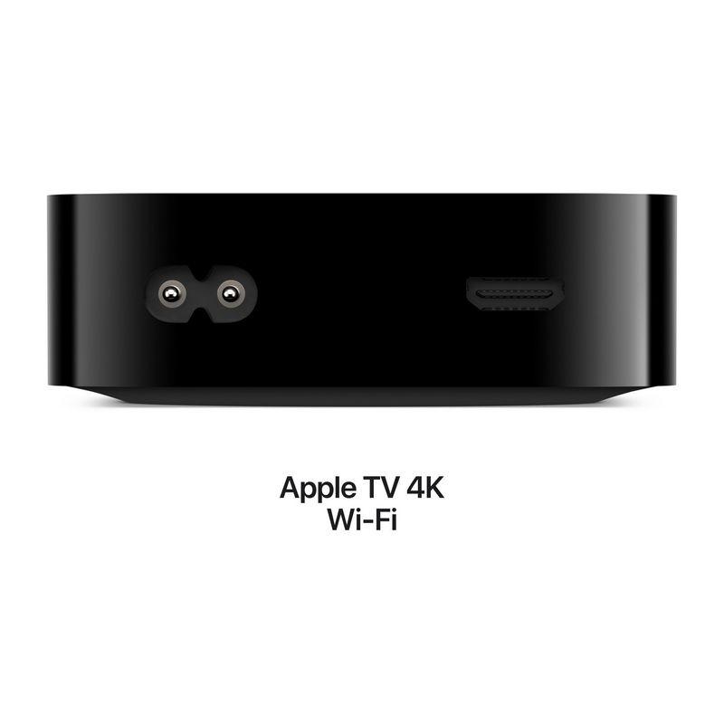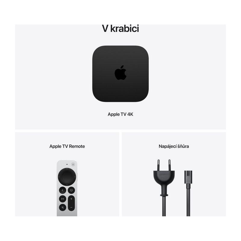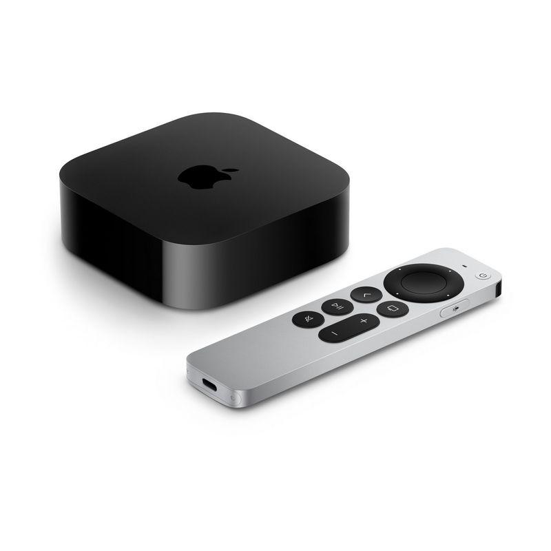 Multimediálne centrum podporujúce špičkové rozlíšenie 4K. Podpora HDR10+, Dolby Vision a Dolby Atmos. Procesor A15 Bionic. Integrovaná pamäť 64 GB. Wi-Fi, Bluetooth v5.0, infračervený prijímač, integrovaný napájací zdroj. Apple TV Remote s konektorom USB-C. Rozmery Apple TV 93 x 93 x 31 mm. Hmotnosť 208 g. Rozmery Apple TV Remote 136 x 35 mm. Hmotnosť 66 g.