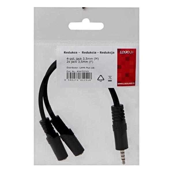 Redukcia 4 pólového kábelu 1x Male Jack (3,5mm) na 2x Female Jack (3,5mm) v čiernom farebnom prevedení