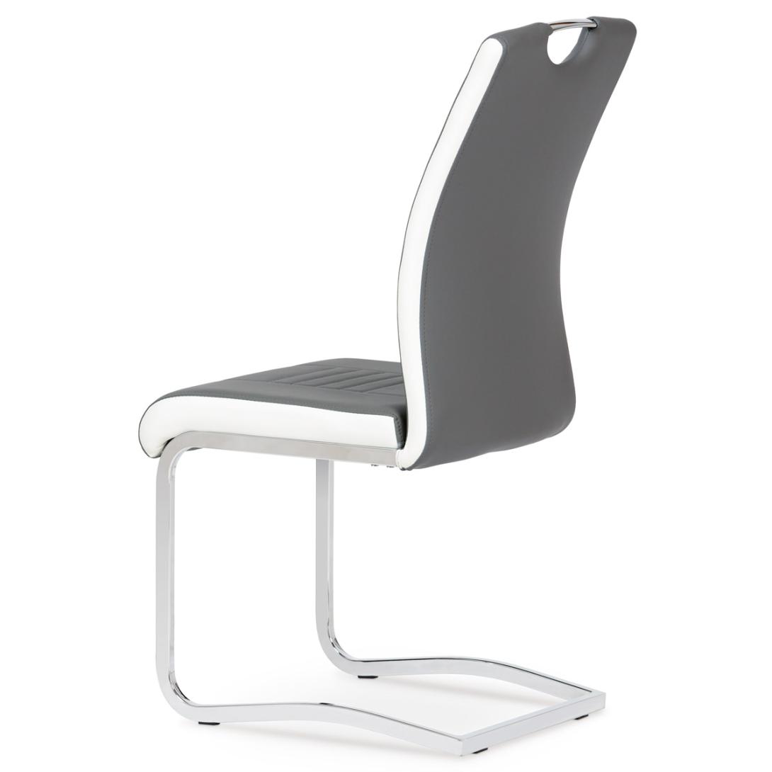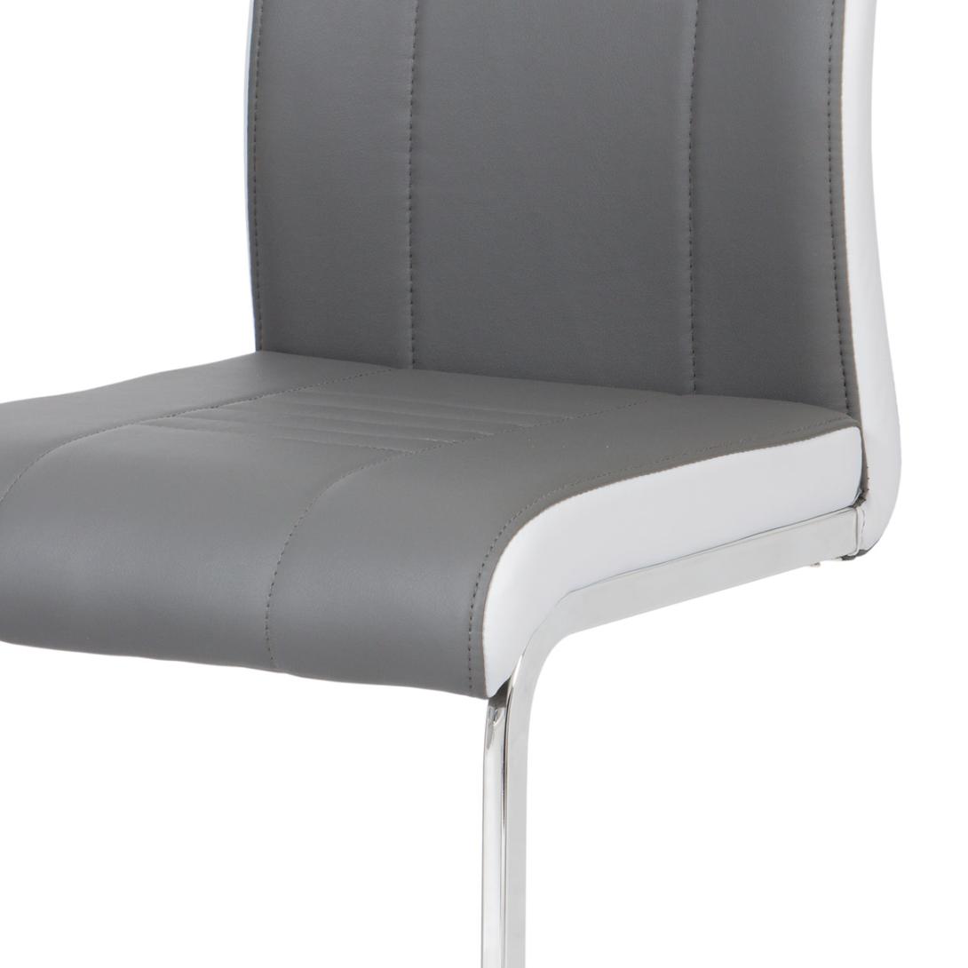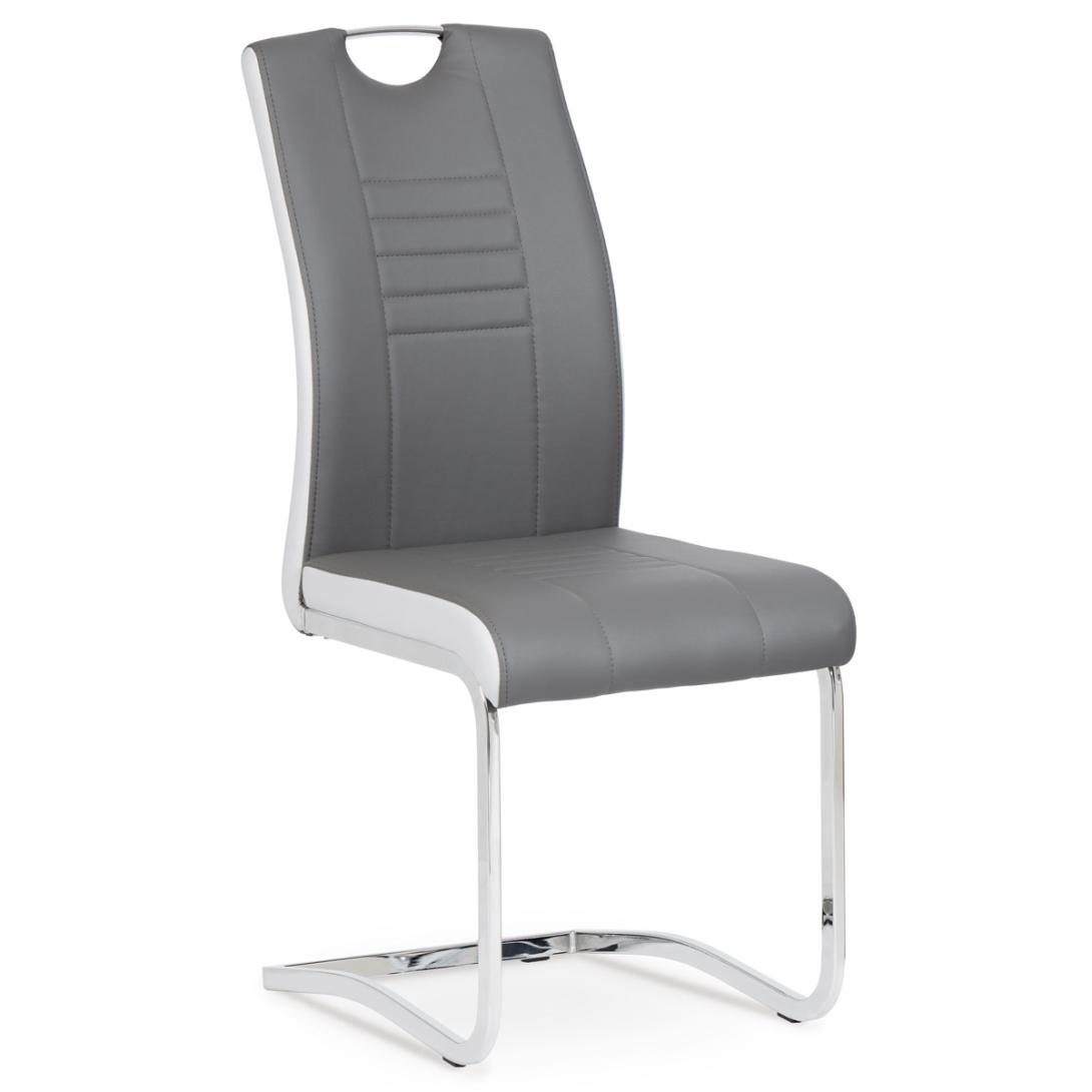 Moderná jedálenská stolička na pohupovať chrómové podnoži, čalúnená koženkou v šedej farbe s bielymi bokmi.