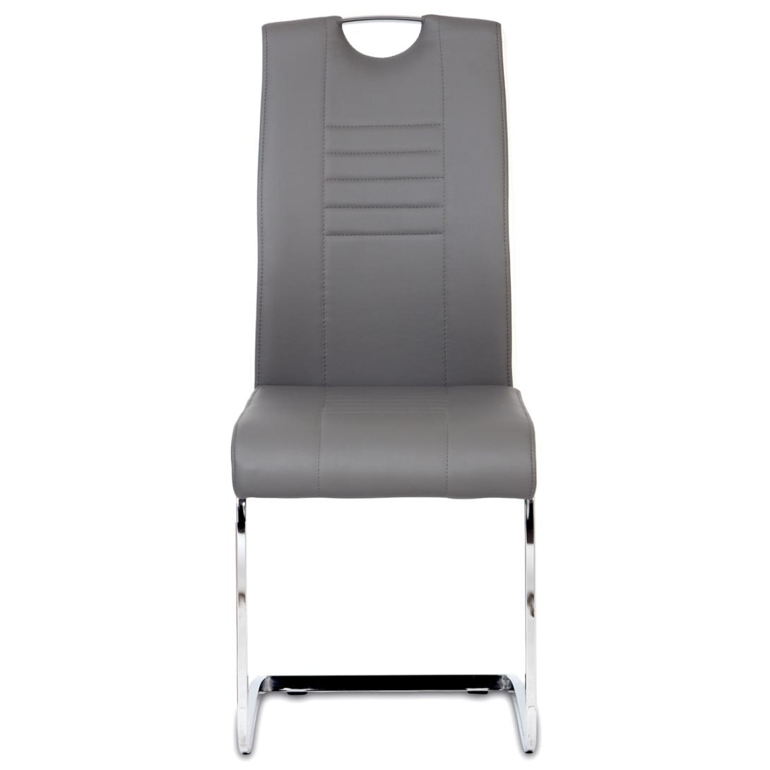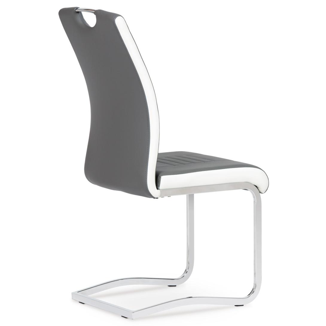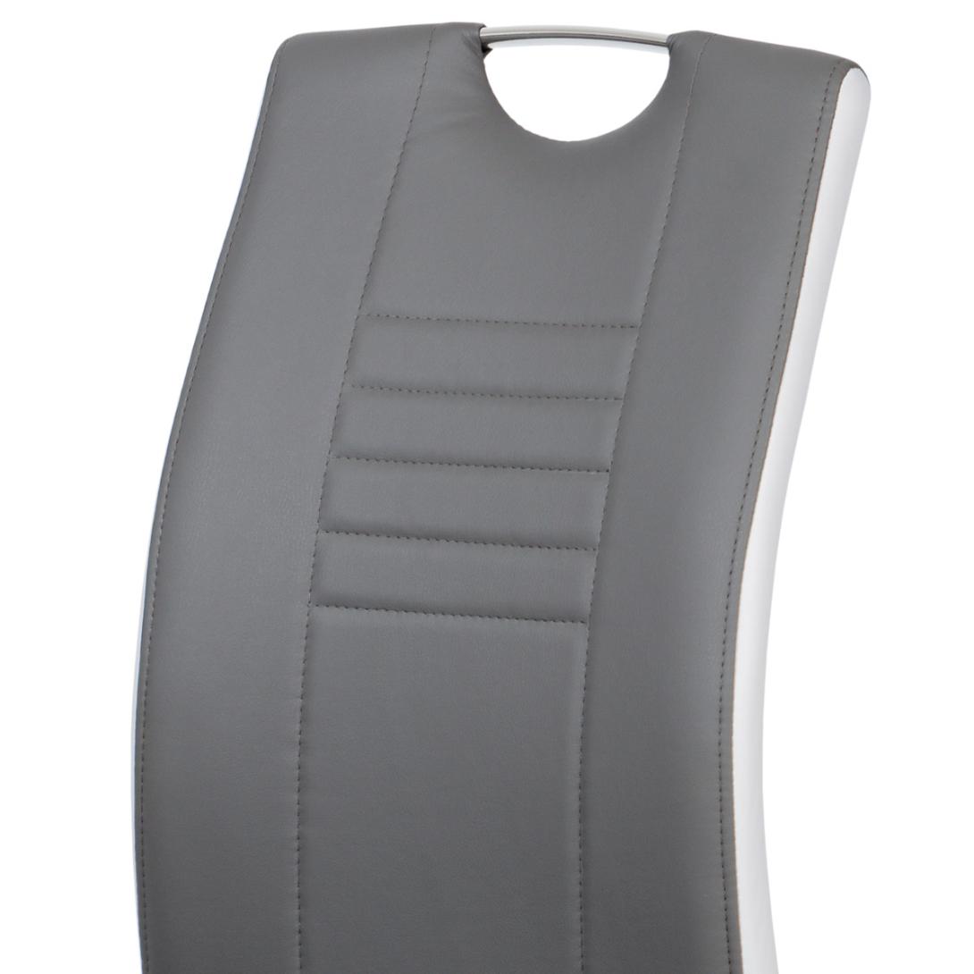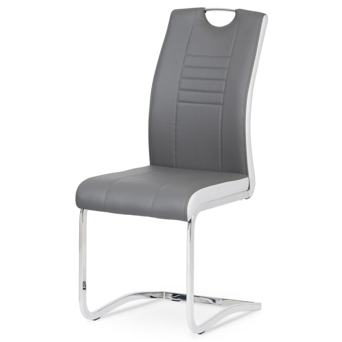 Moderná jedálenská stolička na pohupovať chrómové podnoži, čalúnená koženkou v šedej farbe s bielymi bokmi.