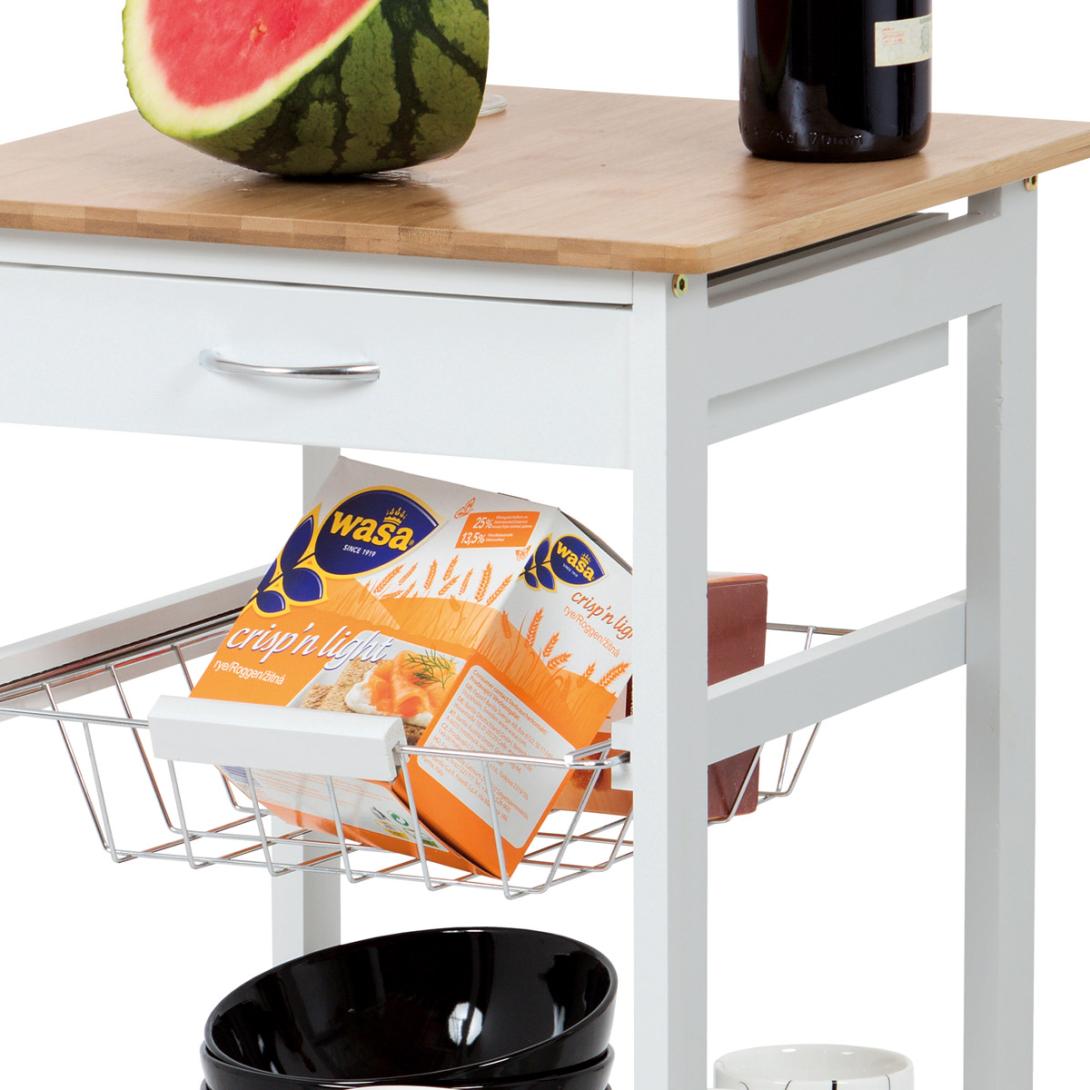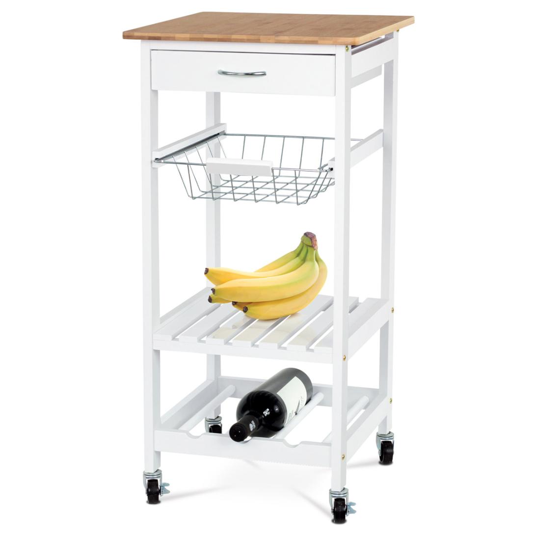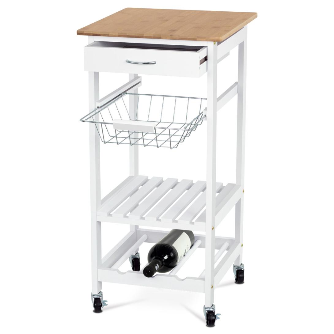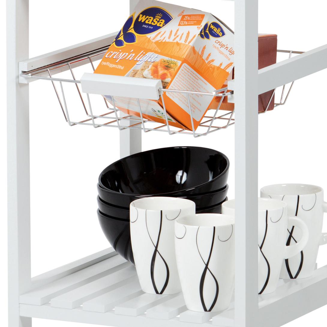 Bambusový regál na kolieskach s brzdami z MDF s úložným kovovým košíkom s chrómovou úpravou a dreveným zásuvkou, bude praktickým a elegantným doplnkom Vašej domácnosti.