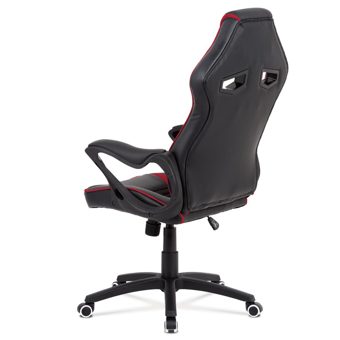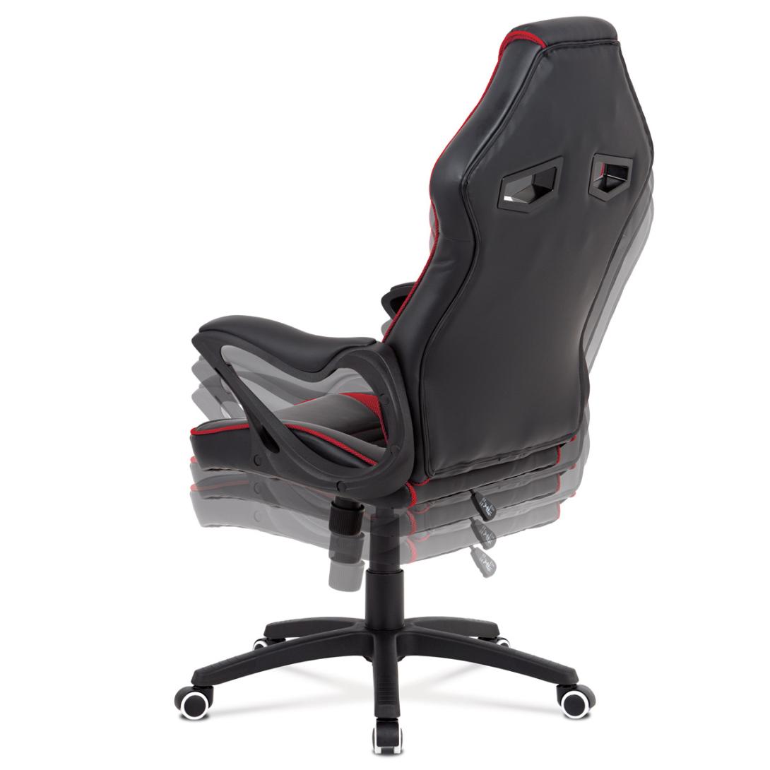 - Herná stolička čalúnená čiernou ekokožou a čiernou a červenou látkou MESH v oblasti podsedu a chrbátu.