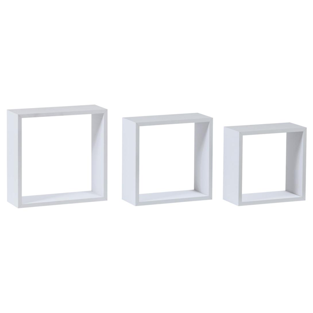 Súprava 3 ks moderných nástenných poličiek rôznych veľkostí v minimalistickom dizajne a štvorcového tvaru.