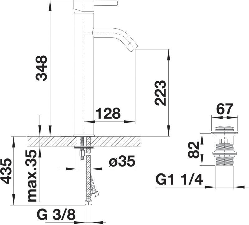 Vysoká chrómová páková batéria, jednootvorová montáž Ø 35 mm, flexibilné prípojky G 3/8", Push-Open uzavierací ventil s tlačním ovládaním 1 ¼"