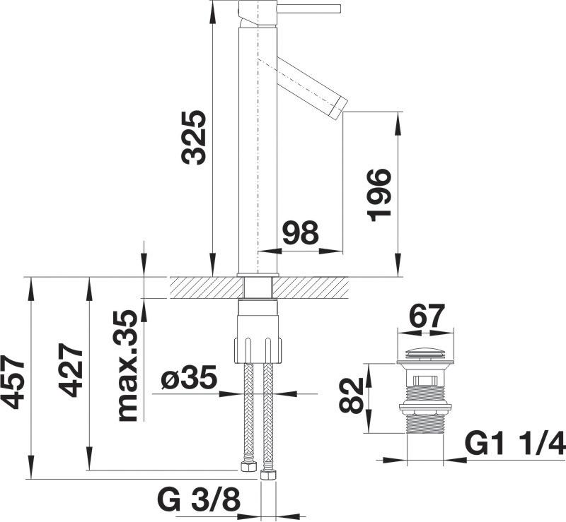 Vysoká chrómová páková batéria, vednootvorová montáž Ø 35 mm, vlexibilné prípojky G 3/8", Push-Open uzavierací ventil s tlačním ovládaním 1 ¼"