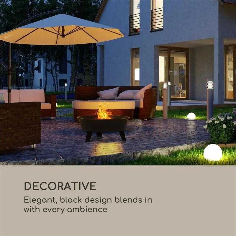 Nádoba na oheň z práškovo lakovanej ocele s grilovacím roštom z ušľachtilej ocele, elegantný čierny dizajn sa začlení do každého prostredia, nádoba na oheň s priemerom 73 cm, so 64 cm veľkým grilovacím roštom.