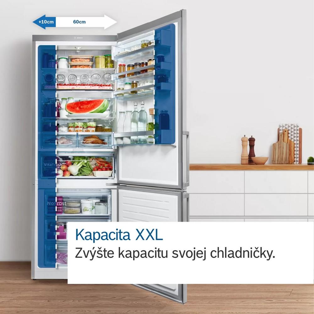 XXL chladničky majú šírku 70 cm a ponúkajú tak o 19 % viac objemu v porovnaní s bežnou chladničkou so šírkou 60 cm. 10 cm navyše veľa miesta v kuchyni nezaberie. Za to v chladničke budete mať priestor s objemom 440 litrov a zmestia sa tam potraviny pre veľkú rodinu. Napr.: 35 litrov mlieka, 9 hlávkových šalátov, 7 kg mäsa a 18 škatúľ vašej najobľúbenejšej zmrzliny.