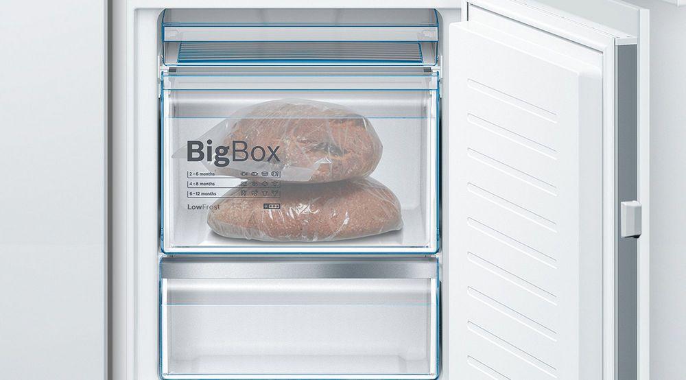 Zásuvka pre praktické usporiadanie už zmrazených potravín alebo potravín o veľkom objeme, napr. ako je torta alebo pizza. Bez ohľadu na to, či sa potrebujete postarať o oslavu narodenín vášho dieťata alebo zmraziť svadobnú tortu – v zásuvke BigBox nájdete dosť priestoru pre veľké zmrazené potraviny.