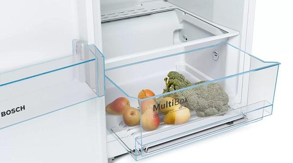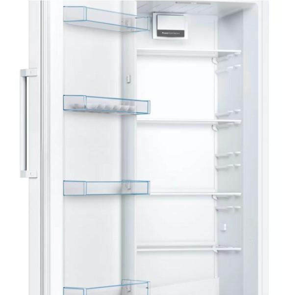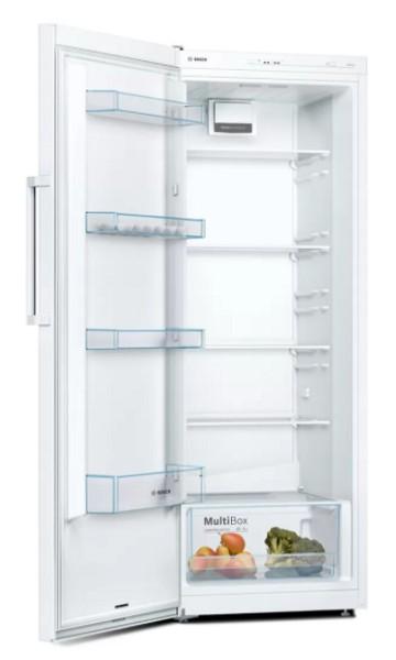 Voľne stojaca jednodverová chladnička Bosch KSV29NWEP v klasickom bielom prevedení s celkovým objemom 290 litrov si nájde miesto aj vo vašej kuchyni a bez problémov sa do nej zmestí váš rodinný nákup. Okrem toho je vybavená technológiou NoFrost, s ktorou môžete zabudnúť na zdĺhavé odmrazovanie. Chladnička sa odmrazí sama, čo šetrí váš čas. Pre pohodlné otváranie je z vonkajšej strany dvierok umiestnené praktické madlo. Je obzvlášť vhodná do domácností, kancelárií alebo na chatu. Vo vnútri nájdete dostatok priestoru pre vaše potraviny. Má špeciálne poličky Easy Access, ktoré ponúkajú dokonalý prehľad a jednoduché uskladnenie. Sú odolné voči nárazu. Mechanizmus plynulého vysúvania umožňuje ich pohodlné využitie. Vnútro chladničky ešte obsahuje: