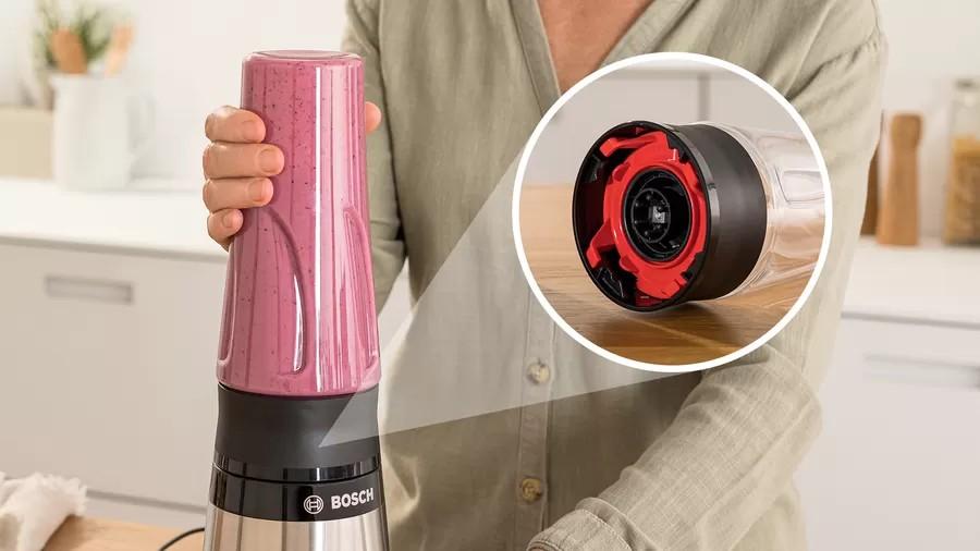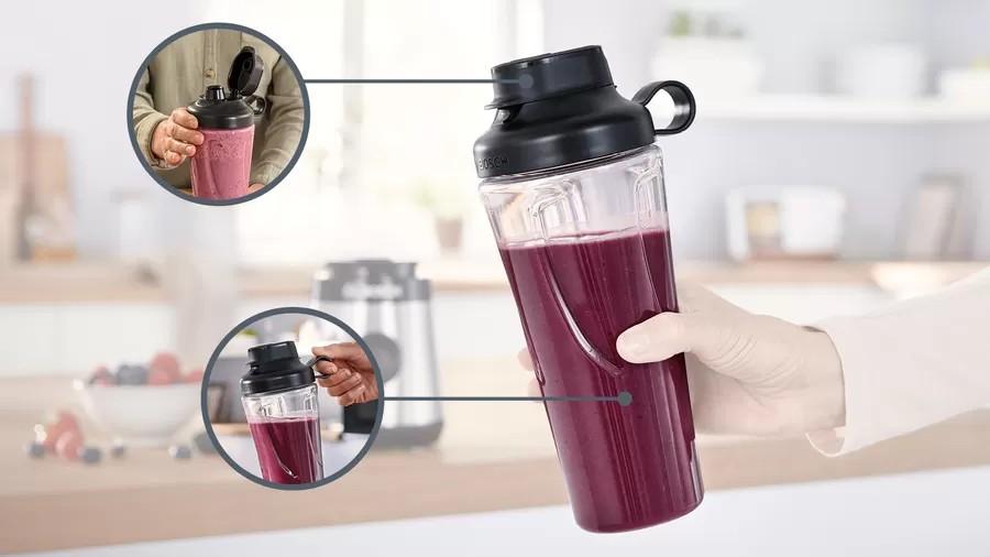 Namixujte si vitamíny rovno do fľaše 2Go a vezmite ju so sebou do práce, školy či na cesty. Ľahká fľaša Bosch MMZBTK1B z odolného tritánu vám bude ideálnym spoločníkom. Vďaka mixovaciemu nadstavcu si pripravte čerstvý džús, smoothie alebo koktail priamo v 2Go fľaši, ktorá svojim 3D tvarom pomáha ideálnej cirkulácii všetkých ingrediencií. Maximálna kapacita je 0,8 l a úžitkový objem 0,65 l. Viečko je tesniace a má ochranu SafeLock proti vytečeniu. Materiál tritán, z ktorého je fľaša vyrobená, je veľmi ľahký, odolný proti rozbitiu a chuťovo aj pachovo neutrálny.