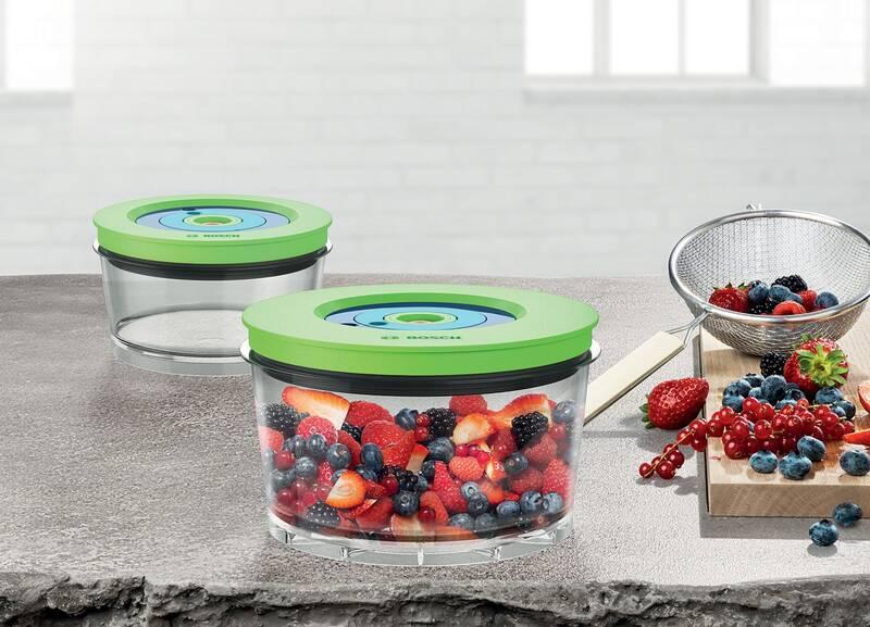 Súprava dvoch praktických dóz Bosch MMZV0SB2 patrí medzi príslušenstvo k vákuovému systému Bosch. Na jednoduché uskladňovanie potravín a predchádzanie plytvaniu sú dózy ideálne. S veľkým objemom 1,5 l alebo menším 750 ml môžete uskladniť napr. ovocie, koreniny, kávu alebo hotové jedlo. Potraviny, ktoré sú zavákuované, vydržia až 2× dlhšie čerstvé. Dózy sú vyrobené z tritanu, ktorý je odolný proti rozbitiu, chuťovo aj pachovo neutrálny. Môžete ich vložiť do mikrovlnnej rúry alebo umývačky riadu. Všetky plasty sú bez BPA. Na vákuovanie využijete nadstavce ErgoMixx, MaxoMixx alebo ručný šľahač s vákuovým systémom.