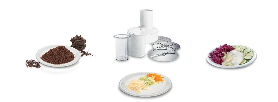 - Veľká multifunkčnosť vďaka kvalitnej cukrárenskej sade (miešacia metla, šľahacia metlička, hnetací hák) a naviac priebehový krájač s tromi kotúčmi na krájanie, strúhanie a rezanie.