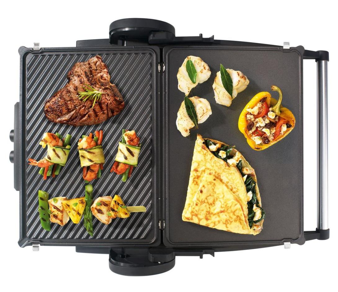 Zdravá kuchyňa, rýchla kuchyňa, lahodná kuchyňa - tri grilovacie pozície kontaktného grilu ponúkajú prakticky neobmedzené možnosti skúšania kreatívnych nápadov. Zatvorený ako kontaktný gril, otvorený ako stolný gril, horný a dolný ohrev s funkciou pečenia, gratinovania alebo ohrievania – na opekanie, grilovanie, gratinovanie alebo ohrievanie. 'Šťavnaté steaky, chutné hamburgery, chrumkavé a do zlatista opečené ražniči, hrianky, sendviče a talianske panini alebo focaccia – vychutnajte si všetko, čo máte radi. Chutné, nízkokalorické a zdravé.