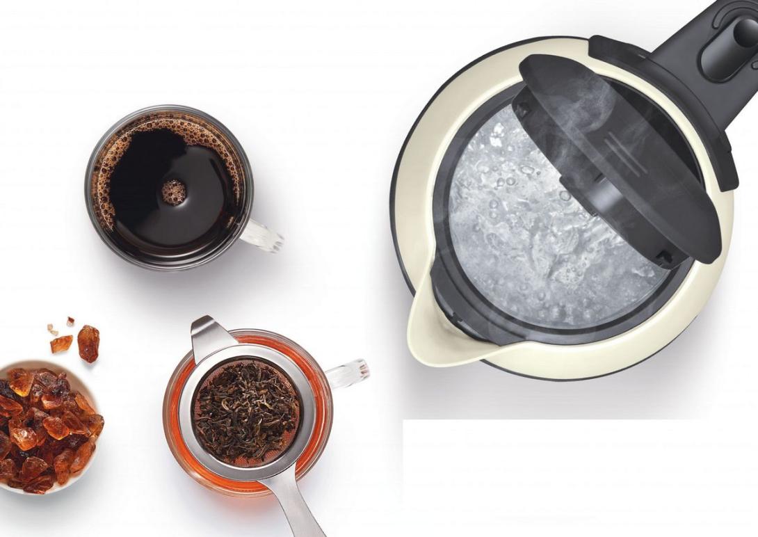 - Trojité zabezpečenie: automatické vypnutie, ochrana proti prehriatiu a vyvretiu vody, vypnutie pri zdvihnutí kanvice zo základne.