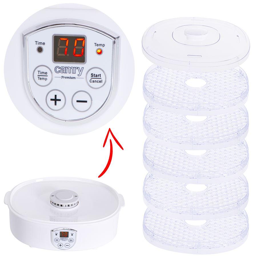 Zdravé občerstvenie? Áno! Každý z nás rád občas zje občerstvenie pri sledovaní filmov, trávení rodinných večerov alebo pri strese, ktorý nás núti hľadať „niečo sladké“. Stačí však použiť sušičku potravín a môžete si vychutnať sladké a slané občerstvenie bez toho, aby ste sa cítili vinní alebo poškodzovali svoje zdravie nezdravými potravinami. Sušička Camry CR6659 v niekoľkých jednoduchých krokoch vysuší vaše obľúbené bylinky, zeleninu, ovocie alebo huby. Zariadenie pozostáva z piatich priehľadných podnosov, ktoré uľahčujú kontrolu procesu sušenia potravín. Regulátor času a teploty zabezpečujú efektivitu a rovnomerné sušenie potravín.