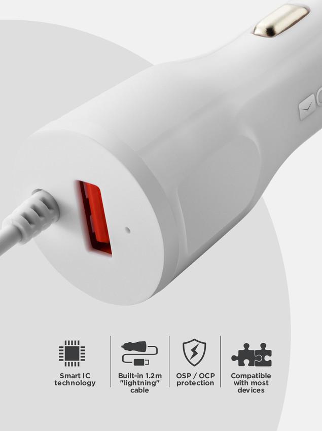 Výhodou tejto nabíjačky je fakt, že okrem klasického 1 x USB, 2.4A portu má integrovaný kábel s Lightning konektorom, takže ho už nemôžete zabudnuť, alebo stratiť. Autonabíjačka umožňuje nabíjanie akéhokoľvek prenosného zariadenia. Optimálna rýchlosť nabíjania a bezpečnosť sú umožnené vďaka implementovanej technológii Smart IC. Špeciálny integrovaný čip identifikuje požiadavky nabíjaného zariadenia na optimálne parametre prúdu. Vaše zariadenia sú tým pádom nabíjané rýchlo, bez hrozby prehrievania, prípadne výpadku citlivých elektronických komponentov.