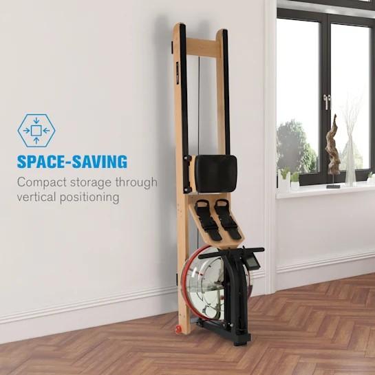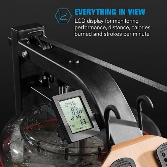 vodný veslovací trenažér, Prehľad o všetkom: LCD displej na monitorovanie výkonu, vzdialenosti, kalórií a záberov za minútu