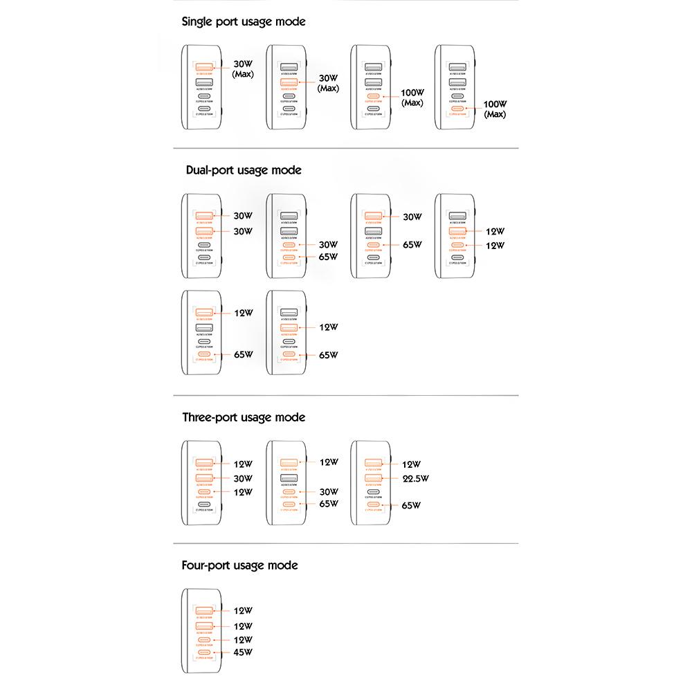 - Výstupný výkon: Samostatné Type-C1 alebo Type-C2: 100W, Samostatné USB-A1 alebo USB-A2: 30W, Type-C1+Type-C2: 30W+65W, USB-A1+USB-A2: 30W+30W, TypeC1+Type-C2+USB-A1+USB-A2: 81W. Celkový výkon max. 100W