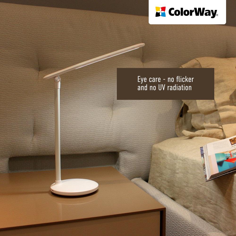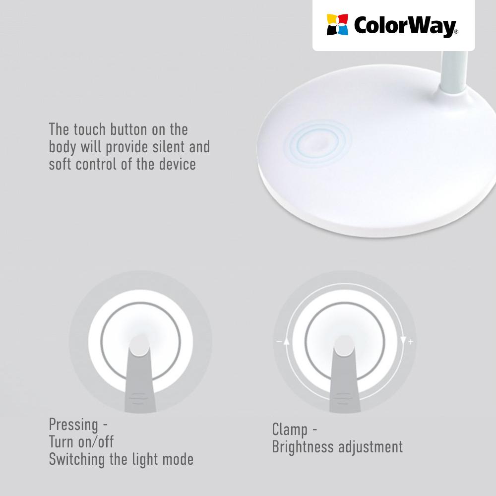Štýlový dizajn a funkčnosť robia svietidlo ColorWay nielen elegantným prvkom interiéru, ale aj nevyhnutným doplnkom, ktorý pomáha zvyšovať produktivitu a efektivitu práce. LED lampa má zabudovanú 1 800 mAh batériu, ktorá poskytuje až 4 pracovné hodiny bez pripojenia k sieti, môžete ju nabíjať z ľubovoľného zdroja vybaveného USB konektorom! Nepotrebujete žiadne ďalšie nabíjacie zariadenia, môžete použiť konektory pre PC alebo notebook, nabíjačku pre smartphone alebo Power Bank, je to rovnake jednoduché ako nabíjanie telefónu, vďaka čomu je lampa skutočne mobilná! Dotykové tlačidlo poskytuje tiché a jemné ovládanie žiarovky. Pre zaistenie pohodlného používania môžete upraviť jas a farebnú teplotu osvetlenia. Používateľ môže podľa potreby nastaviť studené ranné svetlo, ktoré zvyšuje koncentráciu, neutrálne denné svetlo, ktoré je optimálne na čítanie a štúdium, alebo teplé žlté svetlo, ktoré upokojuje a zmierňuje stres. Svetelné prvky poskytujú rovnomerný rozptyl svetla.