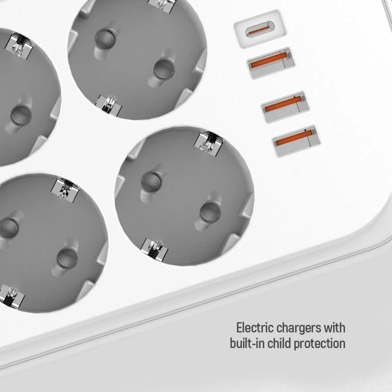 Predlžovací kábel so šiestimi 220V zásuvkami a štyrmi USB portami. Detské ochrana poskytuje bezpečnosť a automatické vyvažovanie záťaže rozdeľuje energiu medzi porty USB (spolu až 36 W). Tri porty USB podporujú rýchle nabíjanie Quick Charge 3.0 a štvrtý port USB-C je port PD s podporou rýchleho nabíjania Apple. Pohodlné tlačidlo zapnutia/vypnutia a LED indikácia uľahčia používanie. Tento predlžovací kábel umožňuje nielen pripojiť elektrospotrebiče, ale aj súčasne nabíjať až štyri mobilné zariadenia, ako sú smartfóny, tablety, externé batérie atď. Kontakty zásuviek sú vyrobené z kvalitnej zliatiny medi, telo je vyrobené z ohňovzdorného plastu, odolného teplotám až do 850°C. Predlžovací kábel má tiež uzemnenie, vďaka čomu je jeho používanie bezpečné.