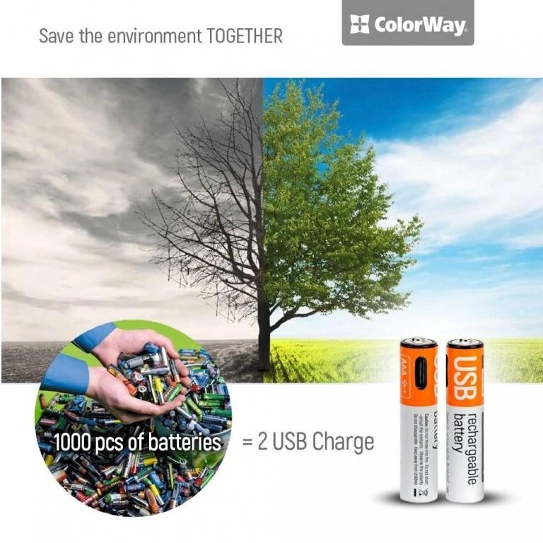 S nabíjateľnými batériami ColorWay USB už nebudete v situácii, keď sa vám obyčajné jednorázové batérie náhle vybijú a musíte ísť kúpiť nové do obchodu - pretože každá nabíjateľná batéria USB môže nahradiť až 500ks bežných batérií.