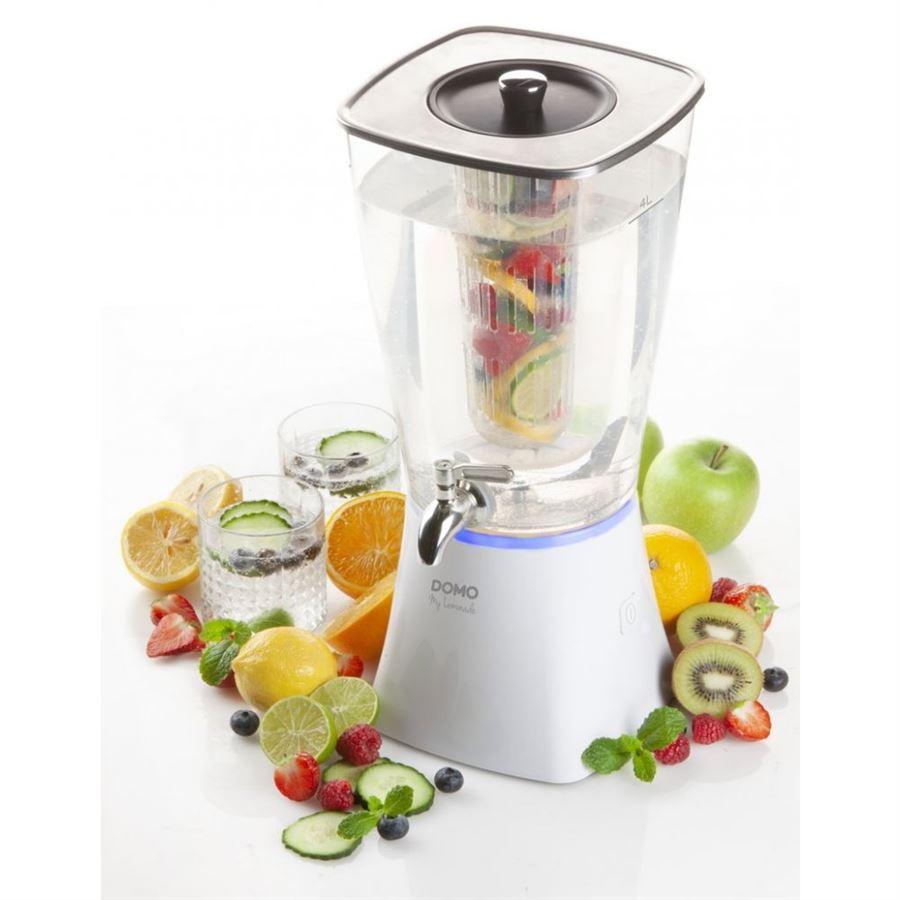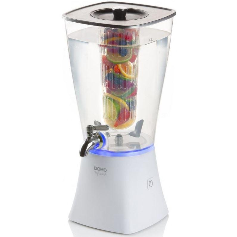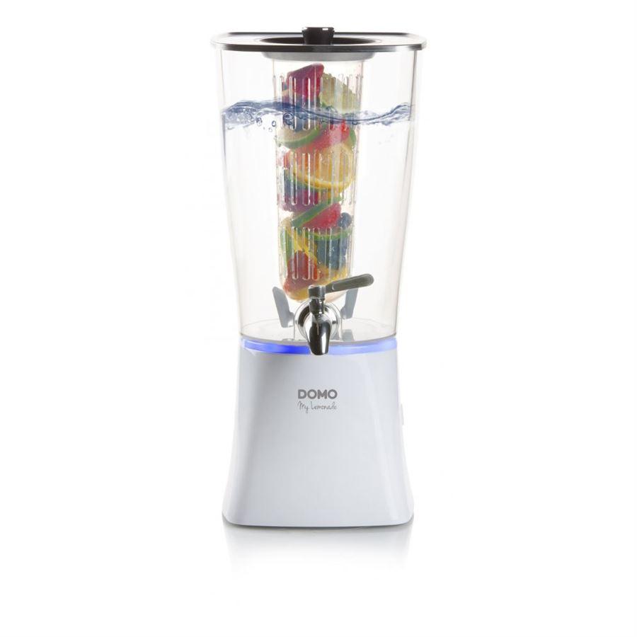 Domáci limonádovník - dávkovač nápojov DOMO DO9197LD s vyberateľnou mriežkou na čerstvé ovocie, bylinky a ďalšie ingrediencie sa vďaka svojmu efektnému podsvieteniu a automatickému miešaniu stane ozdobou každej oslavy, párty, alebo posedenia s priateľmi. Otáčajúca sa vrtuľka na dne nádoby pomaly premiešava vodu cez vložené ovocie a zaisťuje tak rýchlejšie spojenie jeho chuti s vodou. Použité materiály BPA free spĺňajú najprísnejšie normy pre styk s potravinami.