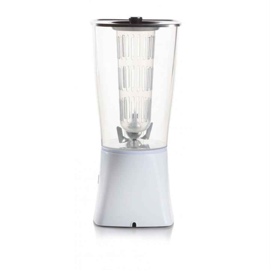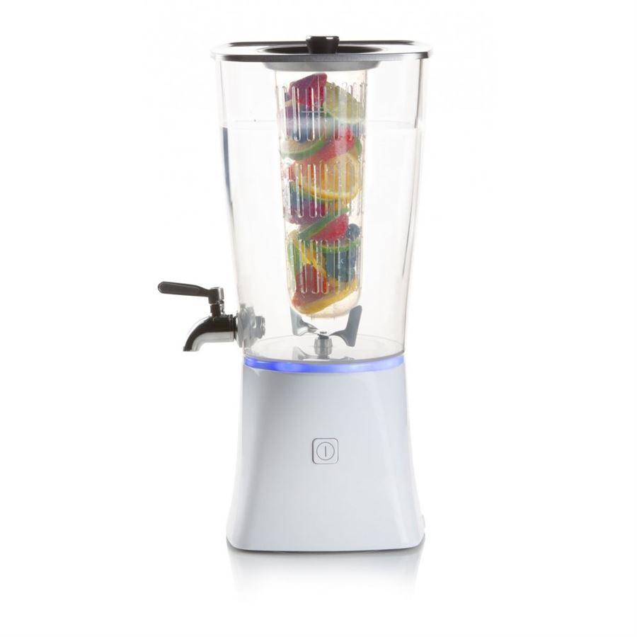 Čerstvo nakrájané ovocie vložte do vyberateľnej vnútornej mriežky, ponorte do zásobníka s čerstvou vodou a tlačidlom na boku spustite miešaciu vrtuľku. Spolu s ovocím môžete do zásobníka pridať aj ľad, mätu, med a iné ingrediencie. Vďaka stálemu miešaniu sa všetky chute premiešajú s vodou v celom objeme nádoby.