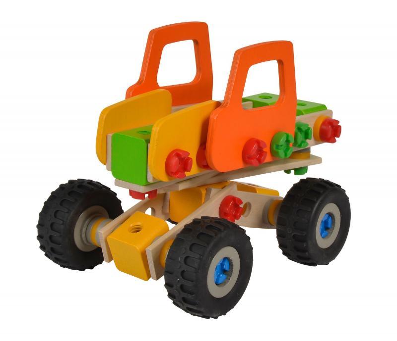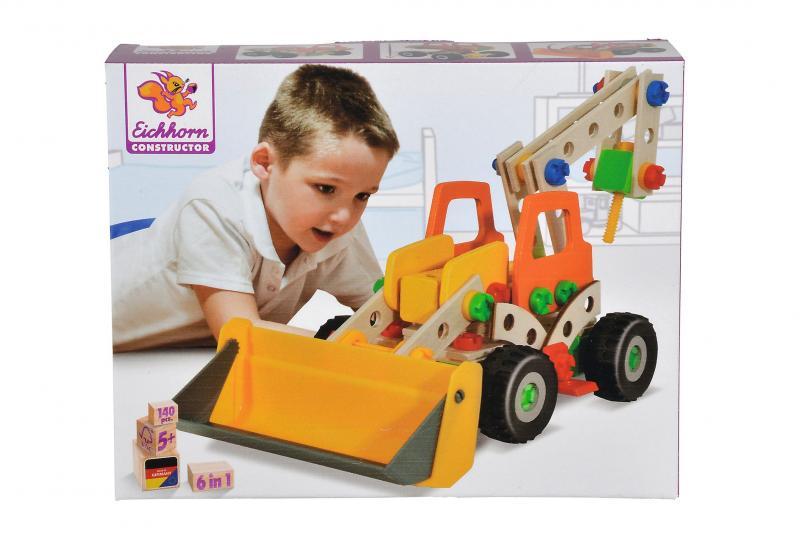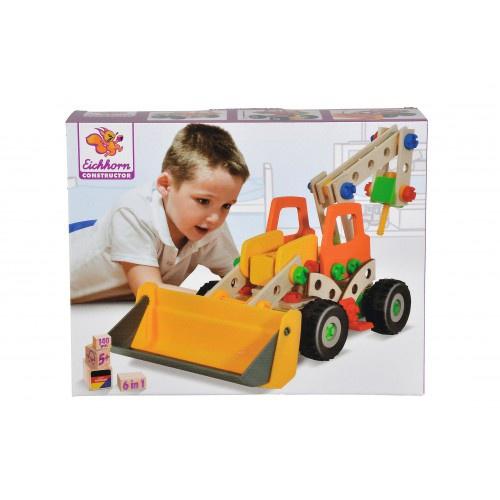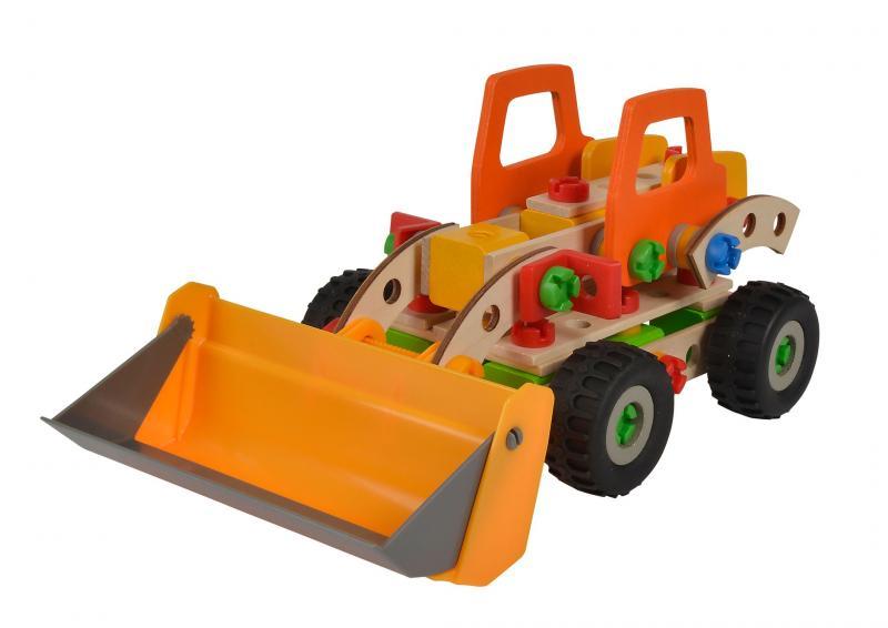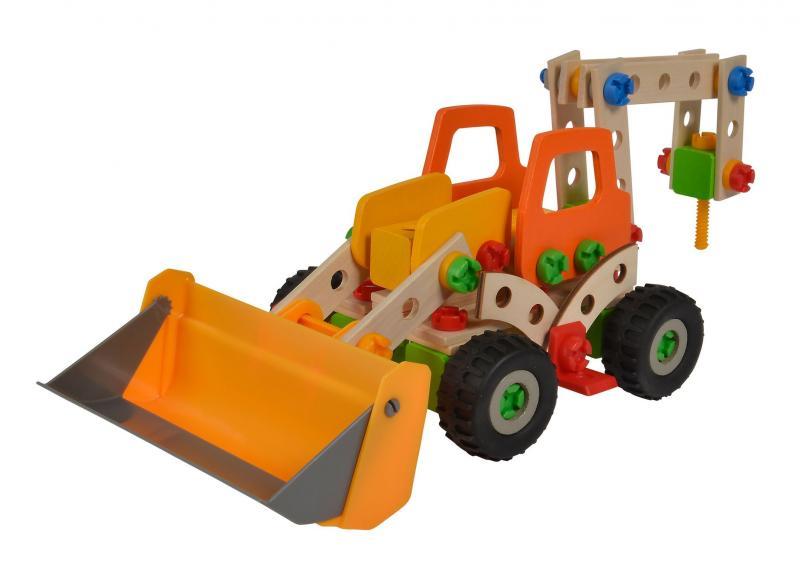 Stavebnica, Drevená stavebnica, z ktorej je možné zostaviť 6 modelov - bager, traktor s drapákom, kolesový nakladač, rýpadlo, unimog, nakladač. Obsahuje 140 dielov. Plastové spojovacie diely.