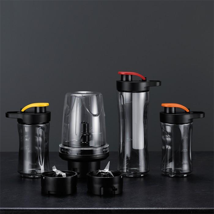 Objavte rozmanité možnosti vďaka všestrannému príslušenstvu: 600 ml fľaša s chladiacou vložkou a vekom s držiakom, dve 300 ml fľaše s viečkami a držiakom, sekacie zariadenie, príslušenstvo na mletie kávy.