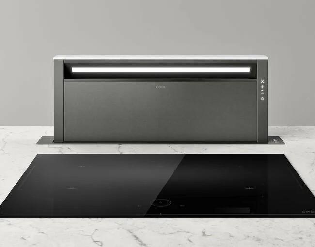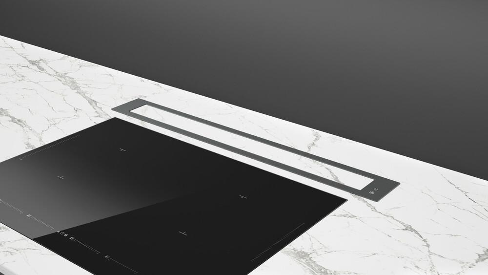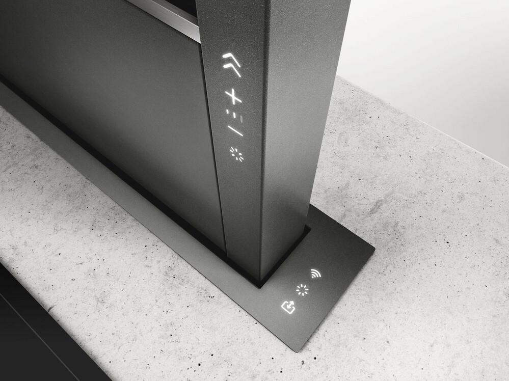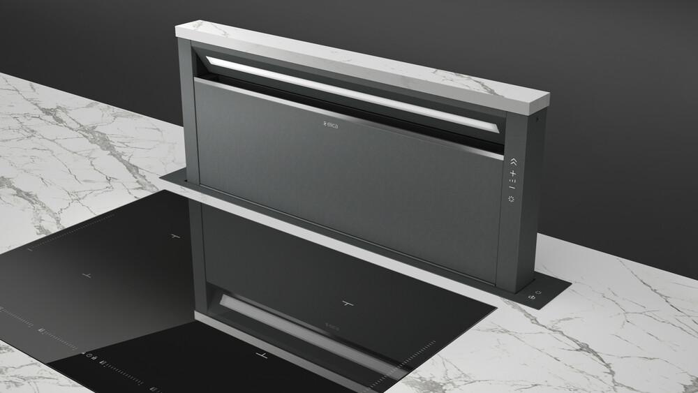 - Odsávač pár je vyrobený z lakovaného kovu s efektom liatina, horný panel možno u tohto modelu osadiť rovnakým materiálom z akého je vyrobená pracovná doska. V zasunutej pozícii nenarušuje čisté línie kuchyne.