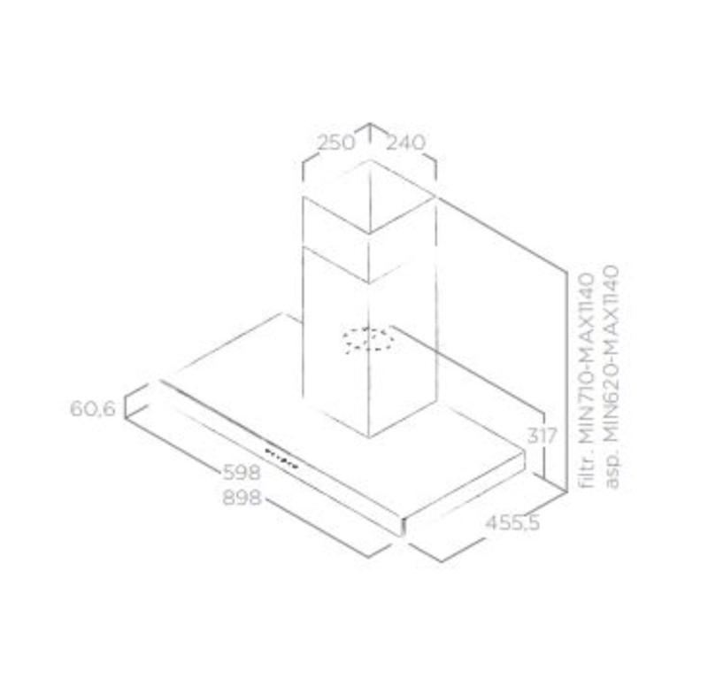 Komínový digestor, Výška minimálna 56.2 cm, Výška maximálna 109.2 cm, Výkon odsávania 713 m3/h, Počet rýchlostí 4, Počet motorov 1, Maximálna hlučnosť 69 dB
