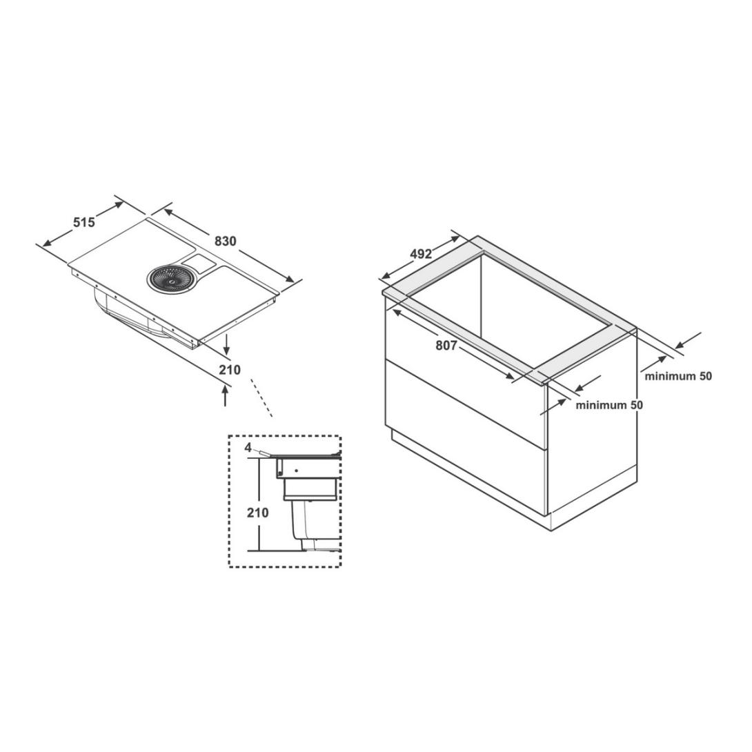 Indukčná varná doska, Celkový príkon : 7,4 kW, Napájacie napätie: 220 – 240 V, Varne zóny: Varne zóny: 2 ( 1,6 – 1,85 kW ) – 210 x 190 mm, 2 ( 2,1 – 3 kW ) – 210 x 190 mm, Bridge zóna: 2