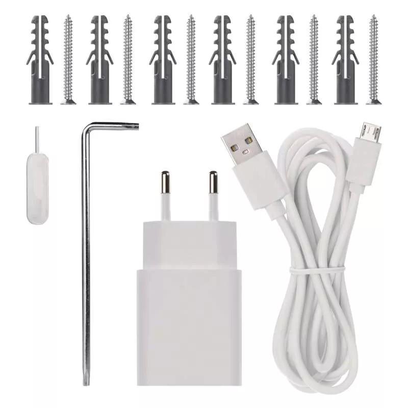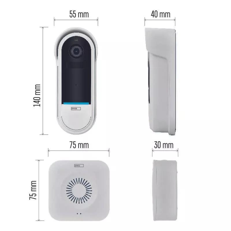 - obsah balenia: 1× zvonček, 1× bezdrôtový zvonček, 1× držiak, 1× sada skrutiek, 1× skrutkovač, 1× pin RESET, 1× napájací adaptér, 1× kábel USB, 3× batérie AA LR6 1,5 V, 1× manuál