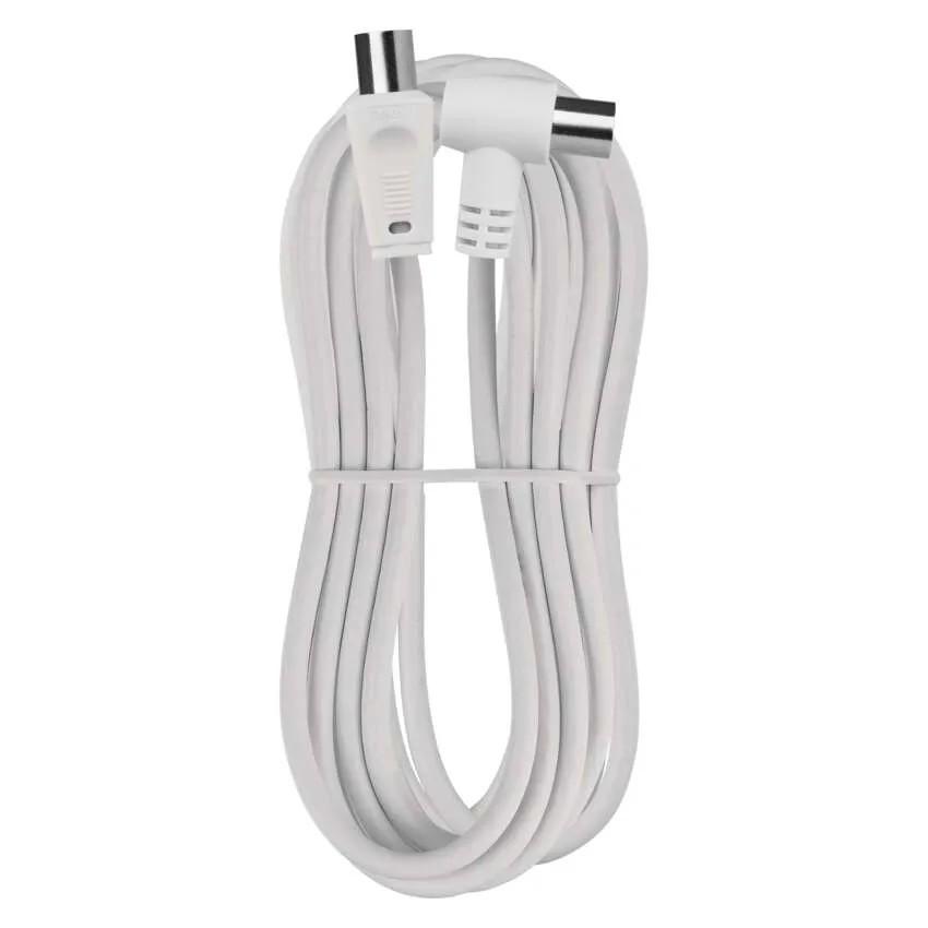 Anténny koaxiálny kábel s vidlicou a zásuvkou IEC. Kábel má uhlový konektor (90°). Kábel má dvojité tienenie pre redukciu elektromagnetického rušenia. Dĺžka kábla je 5 m. Koaxiálny kábel je vhodný pre SAT, DVB-T, ANT, DECODER, FLAT TV a TV.