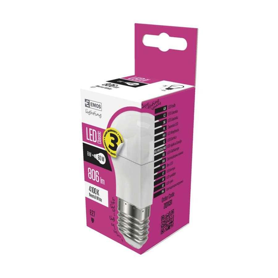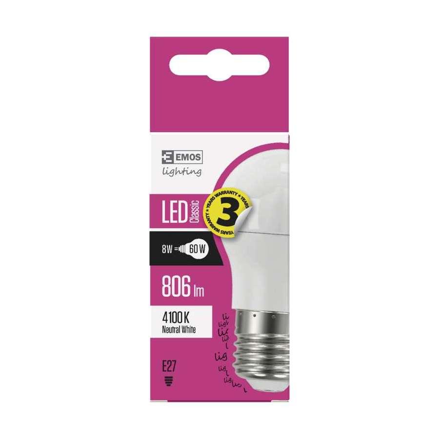 LED Žiarovka, technológia LED, pätica (uchytenie žiarovky) E27, náhrada za žiarovku 60 W, svetelný tok 806 lm, príkon 8 W, teplota chromatičnosti 4 100 K, svetelná účinnosť 101 lm/W