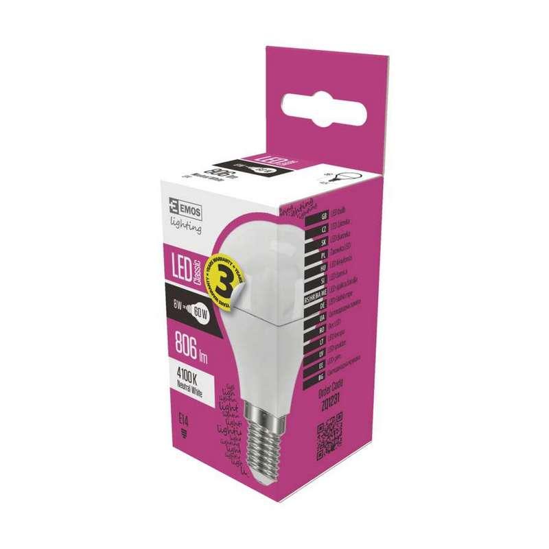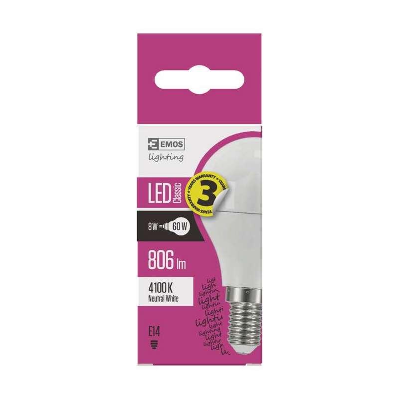 LED Žiarovka, technológia LED, pätica (uchytenie žiarovky) E14, náhrada za žiarovku 60 W, svetelný tok 806 lm, príkon 8 W, teplota chromatičnosti 4 100 K, uhol vyžarovania 270°