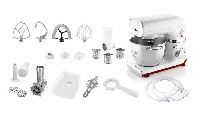 Ku kuchynskému robotu MEZO II obdržíte veľkú nerezovú misu o objeme 4 l na spracovanie až 2 kg cesta a to vrátane priehľadného krytu s otvorom pre jednoduchšie plnenie surovín za chodu. Ďalej obdržíte hnetací hák, metlu na šľahanie, metlu na miesenie a flexi metlu na krémy a ľahké cestá. Ďalej v príslušenstve robota nájdete nástavec na strúhanie (strúhadlo) se 4 strúhadlami, mlynček na mäso o priemere 54 mm (3 veľkosti mlecích doštičiek pre stredné, hrubé a veľmi hrubé mletie, nástavec na plnenie klobás, párkov a jaterníc, nástavec na Kebbe, formovač na cukrovinky a v poslednej rade plastovú násypku, miagač a uvoľňovací klíč). Pri práci s robotom si môžete plynule regulovať otáčky pre optimálnu intenzitu spracovania surovín. O dlhú životnosť prevodovky sa postarajú kvalitné kovové ozubené kolesá. K robotu možno dokúpiť veľmi bohaté príslušenstvo – je len na vás, pre ktoré sa rozhodnete. Medzi dokúpiteľným príslušenstvom nájdete špeciálny mlynček na mak a na obilniny, citrusovač, nástavec na výrobu zmrzliny, ľadových krémov alebo mrazených jogurtov, nástavec na strúhanie s 5 diskovými strúhadlami, lis na bobuľoviny a mnoho ďalších.