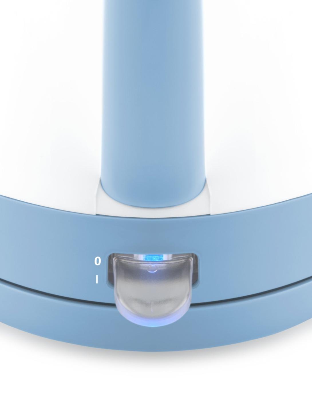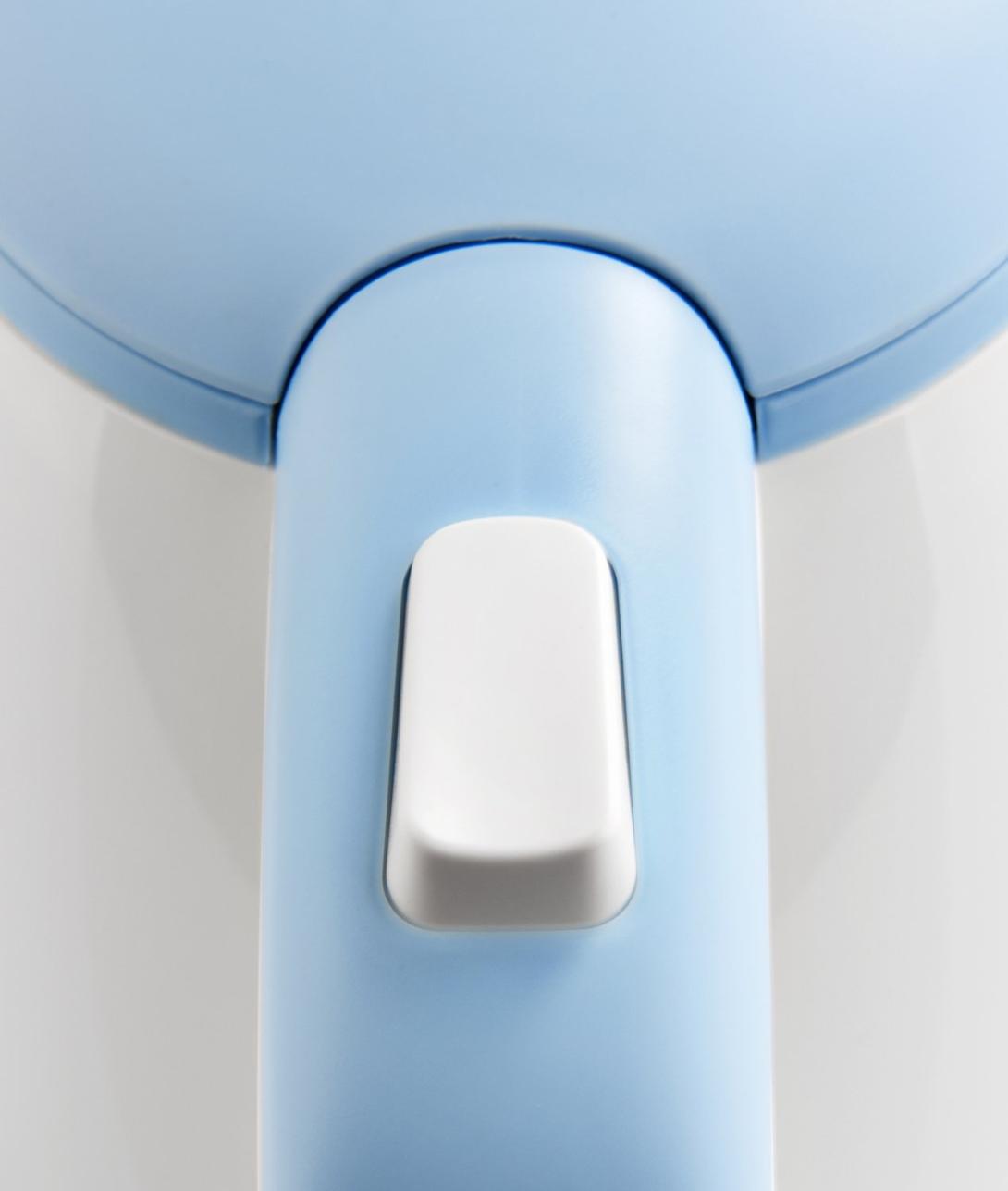 Krémovo modré sfarbenie sa hodí do väčšiny domácnosti. V držadle kanvice je umiestnené tlačidlo na otváranie výklopného viečka. Na spodnej strane základne je priestor pre navinutie kábla, ktorý vám nebude prekážať pri pohľade na váš interiér.