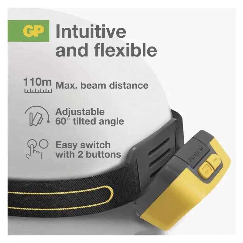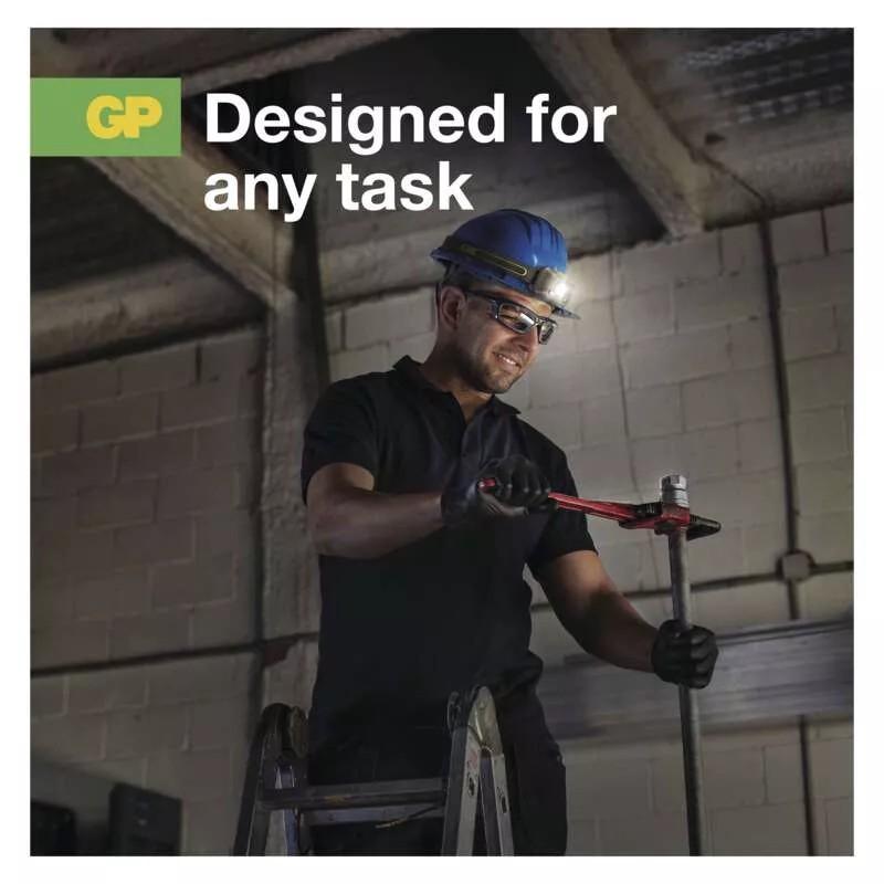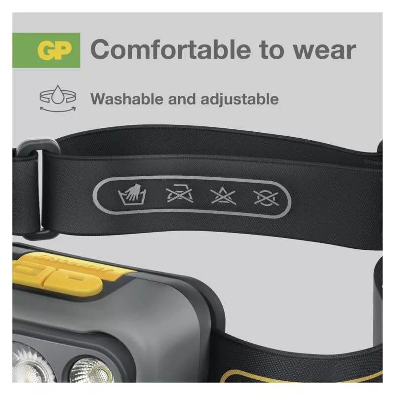Čelovka GP Discovery CHW54 sa pohodlne pripevni k vašej pracovnej prilbe. Jej popruh je nastaviteľný, ľahko sa prispôsobí tvaru vašej hlavy alebo prilby.